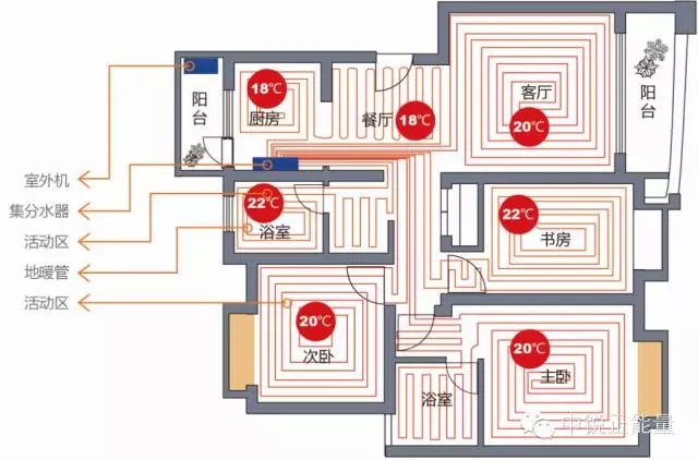 以低溫?zé)崴疄闊崦剑ㄟ^地下鋪設(shè)的專用地暖管道把地表加熱,以整個地面作為散熱面,自下而上均勻地向室內(nèi)輻射熱量,主要有機組,分集水器,地面水管,暖氣片,溫控器及連接配件和輔材6大部分。