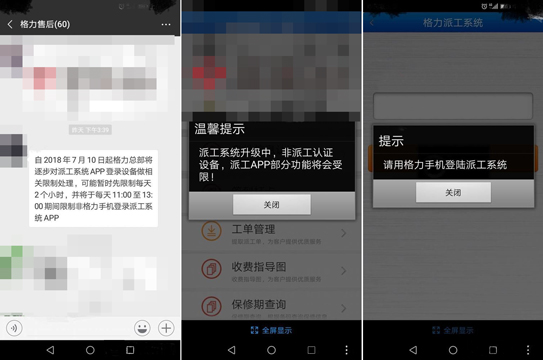 目前,格力派工系統(tǒng)已經(jīng)對(duì)非格力手機(jī)用戶取消了登錄限制,但仍會(huì)出現(xiàn)一條提示顯示: 派工系統(tǒng)升級(jí)中,非派工認(rèn)證設(shè)備,派工APP部分功能將會(huì)受限!