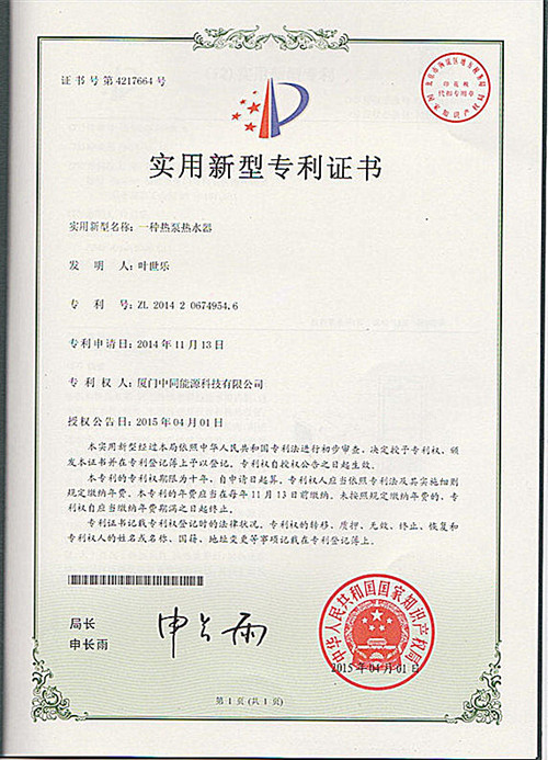近日,中銳空氣能申請的一種熱泵熱水器獲國家實用新型專利證書。